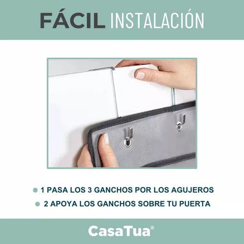 Se instala fácilmente colgándolo en cualquier puerta estándar o en una pared con ganchos adhesivos. No necesitas herramientas adicionales.